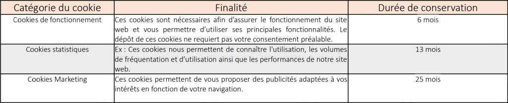 Nous utilisons plusieurs catégories de cookies sur notre site, dont les caractéristiques sont décrites ciaprès :
